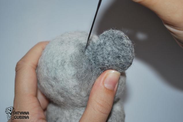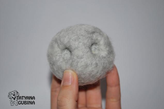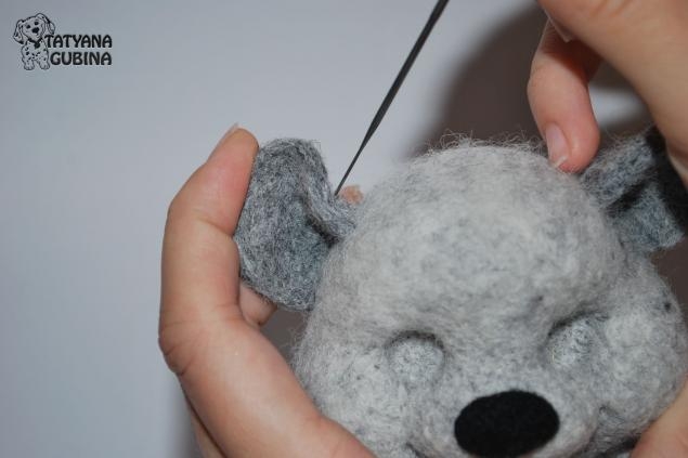 На губке сваляйте маленькие ушки полукруглой формы из серой шерсти и черный нос, ориентируясь на размер головы.