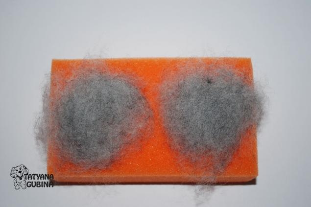 59. Пришло время отшлифовать ту поверхность, которую мы не будем обрабатывать обратной иглой. Шлифуем поверхность при помощи маленьких, хорошо распушенных кусочков шерсти. Прикладываем такой кусочек к поверхности и проходимся по ней иглой № 38- звездочка, часто- часто. Таким образом выравниваем поверхность лапок и мордочки.