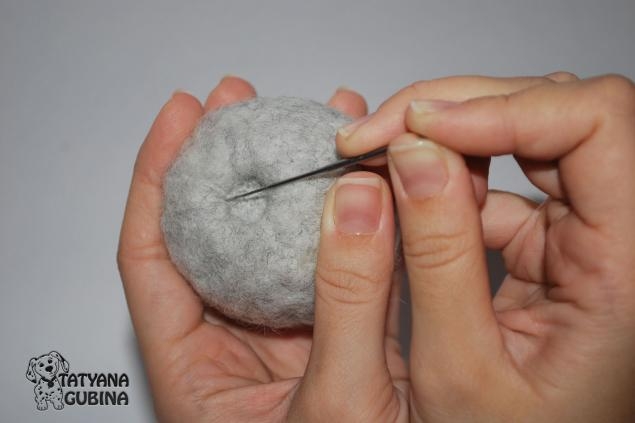 3. Приваливаем головку к туловищу грубой иглой №36 и кусочками шерсти.