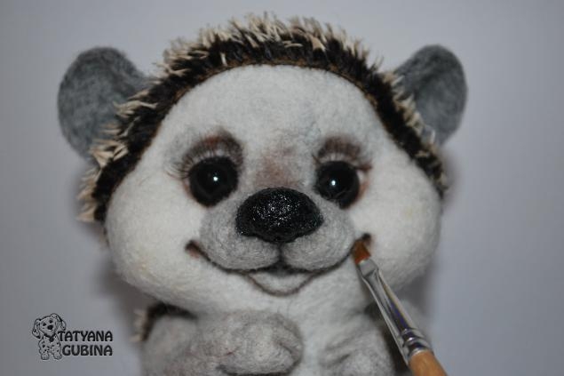 Используя кисть и тени для век, «оживите» зверька. Пройдитесь аккуратно по линии улыбки, вокруг глаз, над веками, поставьте точечки-бровки. Также можно иглой выделить пальчики на лапках и прорисовать тенями.