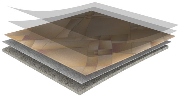 Многослойное покрытие линолеума состоит из основы, стекловолокна, поливинилхлоридной пасты, слоя с изображением, слоя защиты и двух подложек (механической и химической).