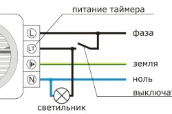 - Если в конструкции предусмотрен таймер, то подключение системы производится по нижеуказанной схеме. Питание для таймера подается от светильника, чтобы система включалась по истечении определенного времени или одновременно с включением света. Такой вариант удобен в использовании, но иногда требуется отключить вентилятор и включить его, что с автоматической системой сложно;