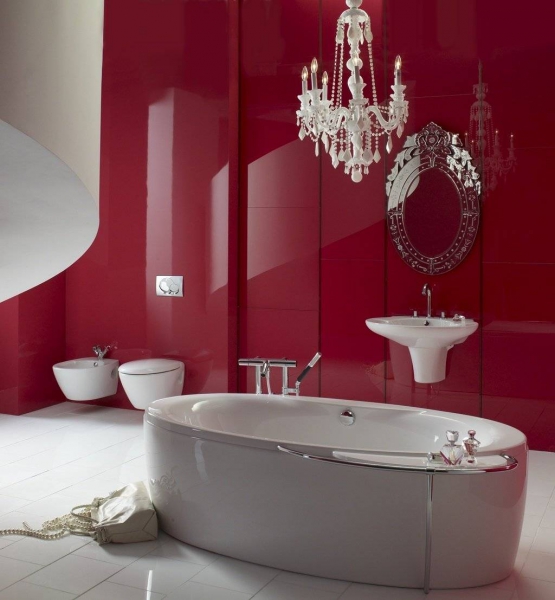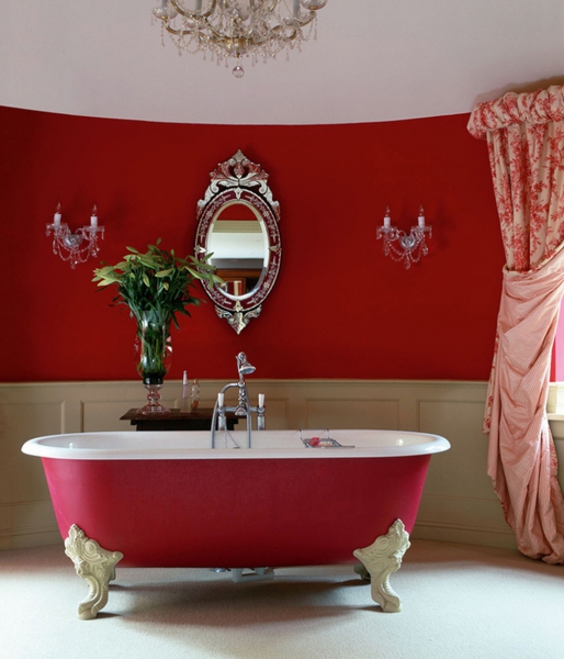 Использование в красном цвете в оформлении комнаты где стоит ванна исчерпывается вашей фантазией и площадью помещения.