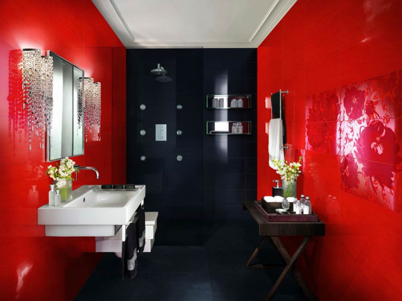В случае преобладания черного цвета над красным, уместно будет применять в ванной комнате дополнительные осветительные приборы, которые компенсируют недостаток света в помещении. Разнообразная система освещения из источников отраженного света, искусственного и естественного света поможет выгодно «играть» красно-черным краскам в ванной комнате.
