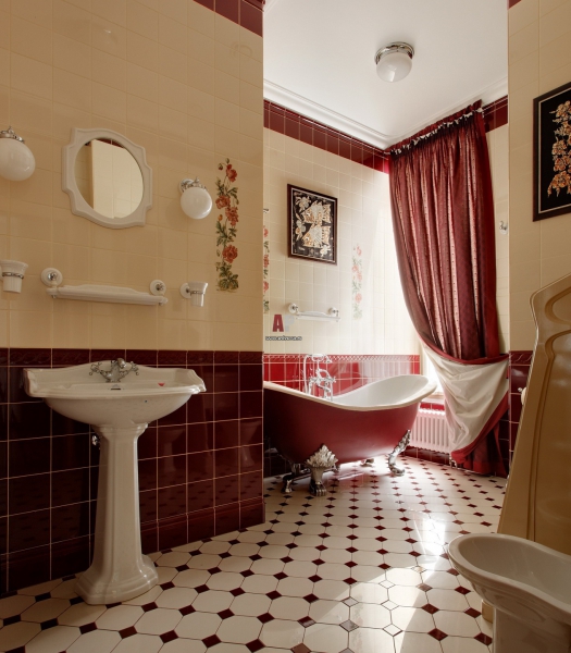 Прекрасно смотрится красная ванная комната, как в историческом, так и в современном убранстве.