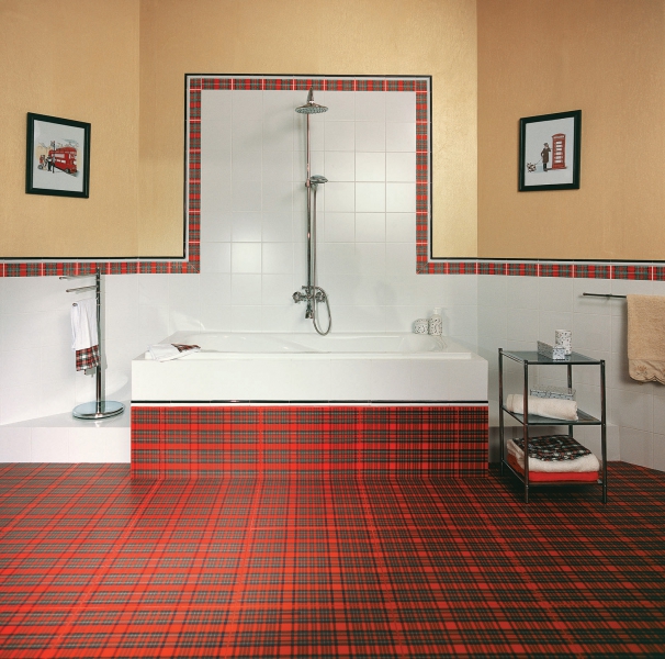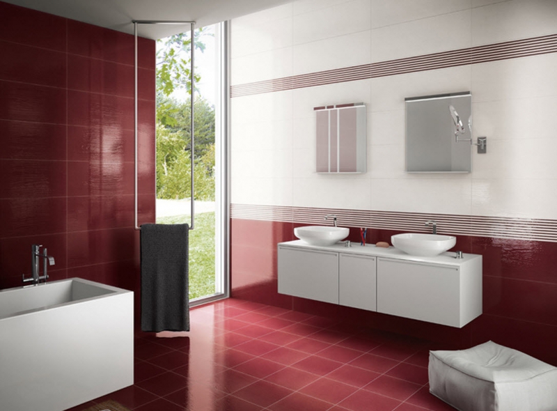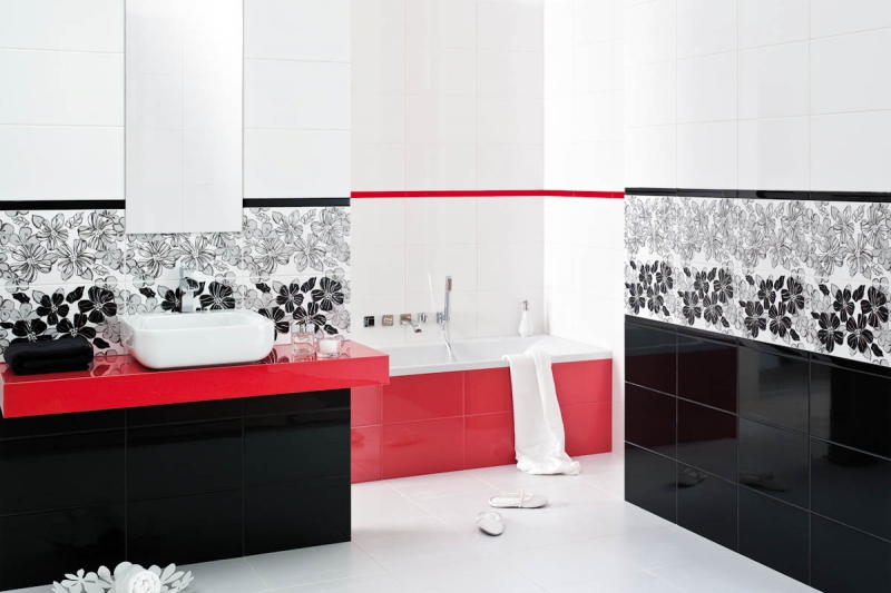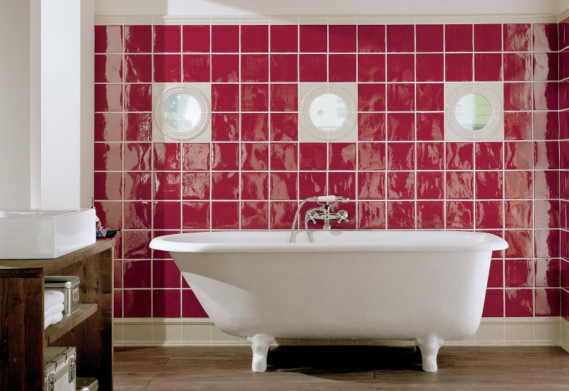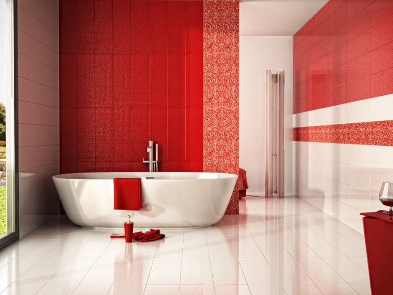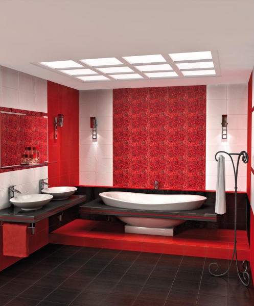 Толковое использование красной плитки в оформлении комнаты где стоит ванна — абсолютно всегда выигрышный вариант. При ее помощи можно разделить помещение, «зарядить» его энергетикой и теплом и в тоже время выделить особенность. Прекрасно будет выглядеть плитка красного цвета с чёрным узором с цветами. Прибавят роскоши в интерьер золотистые узоры. А плитка красного цвета с древесной текстурой или кожи выполнит дизайн неповторимым. Изготовители рекомендуют коллекции, где красный восполнен очень разными цветами: от обычной бело-красной гаммы до необычных сочетаний с зеленым и синим. Можно выбрать плитку из керамики всякого оттенка из палитры: от глубоких, родных к коричневому оттенков (бронза, терракот), прохладного цвета фуксии, брусники или малины до ярких оранжево-красных цветов.
