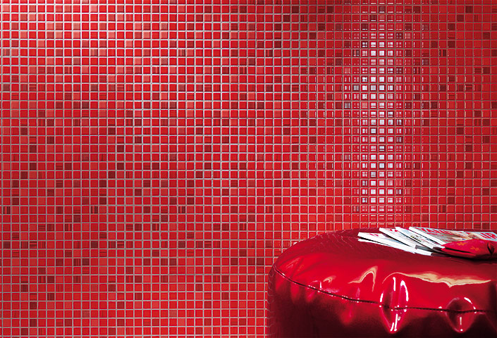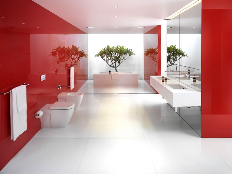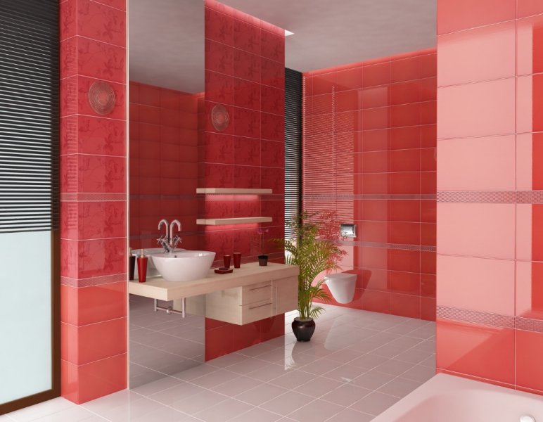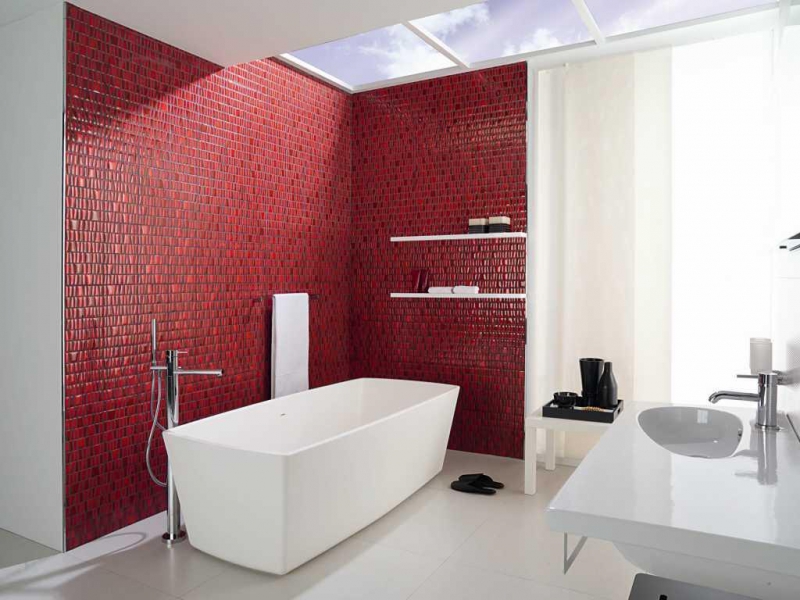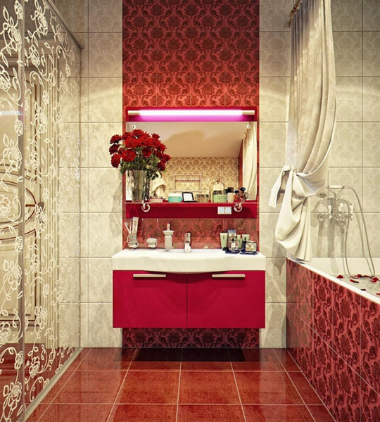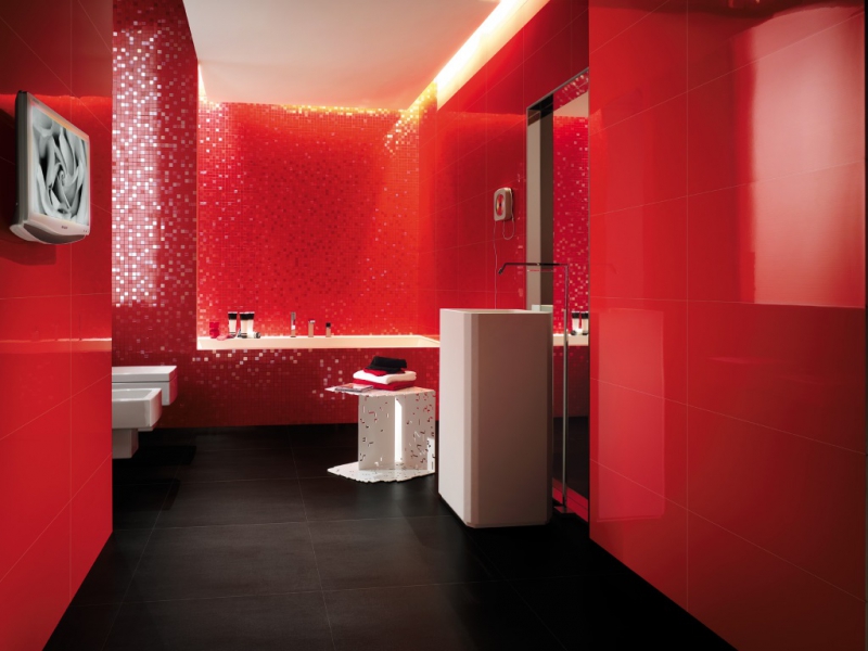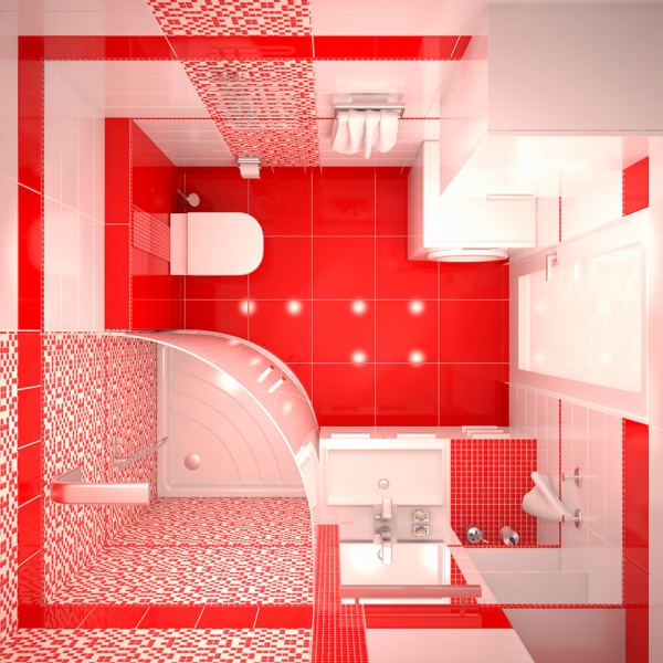 Для малой площади комнаты не стоит делать стены ярко-красными, так как это визуально уменьшит помещение, и психологически создаст эффект давления. А вот пунцовые предметы на белом фоне керамической плитки с глянцевой поверхностью создадут видимость расширенного пространства.