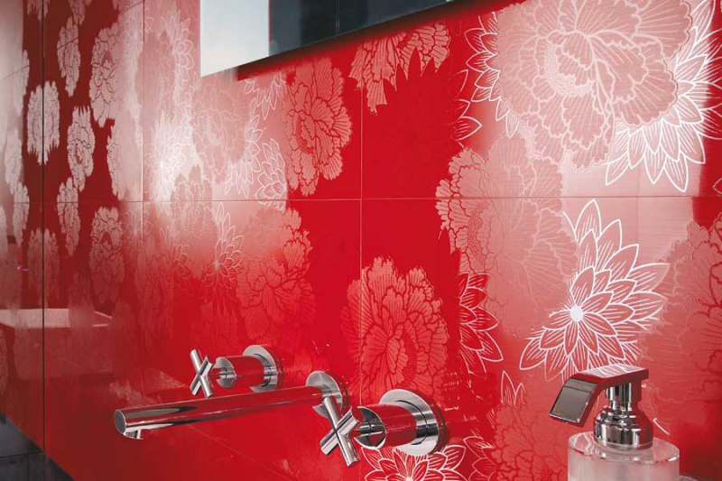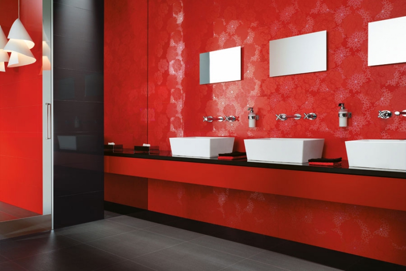 Грамотное применение красной плитки в интерьере ванной комнаты — всегда выигрышный вариант. С ее помощью можно зонировать помещение, «зарядить» его энергией и теплом и одновременно подчеркнуть индивидуальность. Отлично будет смотреться красная плитка с черным цветочным узором. Добавят роскоши в интерьер золотые орнаменты. А красная плитка с текстурой дерева или кожи сделает дизайн эксклюзивным. Производители предлагают коллекции, где красный дополнен самыми разными цветами: от привычной бело-красной гаммы до необычных сочетаний с зеленым и синим. Можно подобрать керамическую плитку любого оттенка из палитры: от глубоких, близких к коричневому тонов (бронза, терракот), холодного цвета фуксии, брусники или малины до ярких оранжево-красных расцветок.