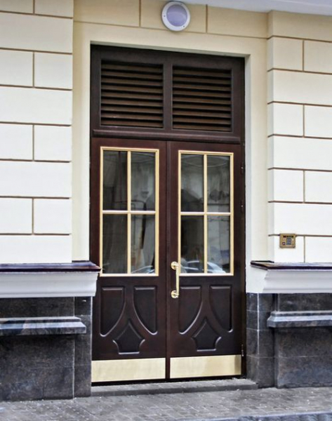 - Деревянные. Перед установкой металлических дверей, в подъездах устанавливались деревянные полотна. Они могли изготавливаться из ДСП, ДВП или массива сосны, покрытого фанерой, или МДФ. В Европе устанавливаются резные двери из массива дуба на парадных входах. Они могут иметь одну створку или быть двустворчатыми.