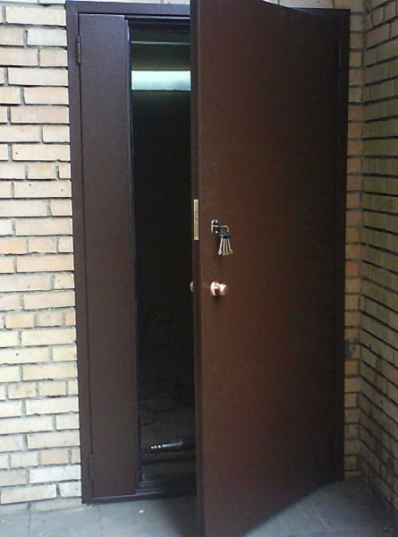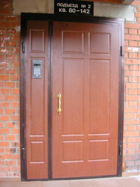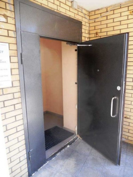 Первый вариант выбирают, когда на входе в подъезд совсем нет дверей или они слишком хлипкие и неутепленные. Здесь понадобиться изделие с двумя створками (основной и второстепенной), наружным листом стали 1,0-1,5 мм, утепленное минеральной ватой. Отделка должна быть из влагоустойчивых веществ, где лучше всего подойдет порошковое напыление.