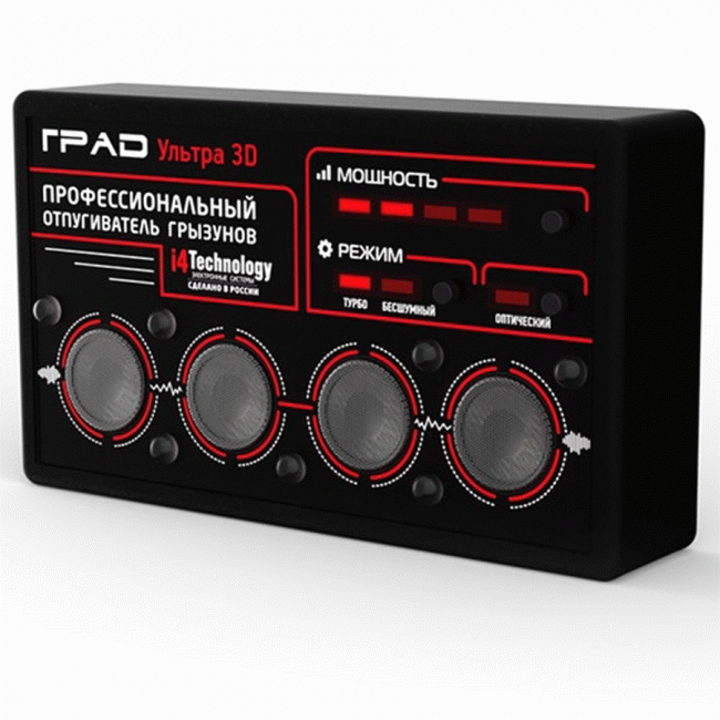 Отпугиватель ГРАД А-1000 ПРО создан и выпускается в России. Это устройство генерирует неповторяющуюся последовательность волн ульразвуковой частоты, гарантирующую отсутствие привыкания. Кроме крыс и мышей ГРАД а-1000 ПРО легко справляется практически со всеми вредителями в хозяйстве, так как имеет 4 режима работы: