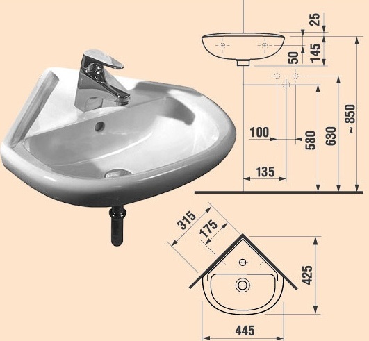 Чаша раковины соединяется при помощи выпуска и 20-сантиметровой трубки с сифоном.