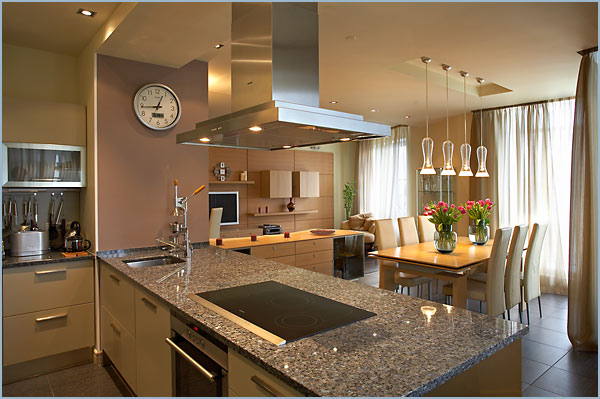 Совмещая кухню с гостиной, владельцы дома получают удобное функциональное помещение. Приготовление пищи становится комфортнее благодаря тому, что хозяйке не нужно уходить в другую комнату. «Колдуя» над очередным блюдом, она может продолжать общение со своими домашними и гостями.