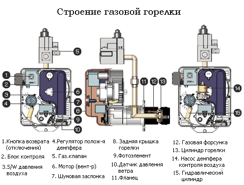 Горелки котла условно подразделяют на два вида — атмосферную и наддувную горелку, иногда называемую турбинированной, навесной, или вентиляторной.