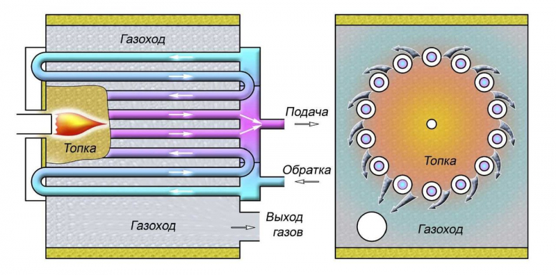 В обычных приборах продукты сгорания минуют теплообменные поверхности и отдают часть энергии рабочей среде отопительной системы. Отработанные газы отводятся через обычный дымоход. В данном случае теряется определенная часть тепла в виде водяного пара, появившегося при сжигании топлива.