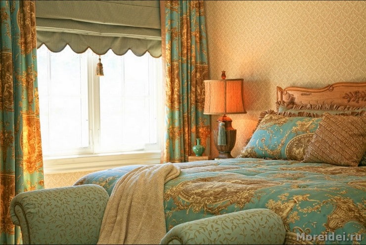 Обилие тканей в магазинах легко позволит найти нужную расцветку и рисунок. Покрывало в комнате может соответствовать цвету портьер.