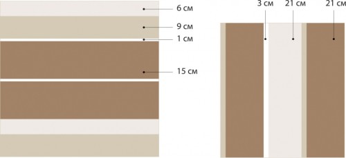 Полосы привносят разнообразие во внутреннее оформление помещения и корректируют некоторые его пропорции. Представим еще две схемы рисунков вертикальных и горизонтальных полос, выдержанных в оттенках кремового, бежевого и коричневого цветов.