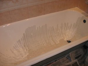 - После шлифовки поверхность необходимо ещё раз обезжирить. Перед этим ветошью, не оставляющей ворсинок, с помощью растворителя очищаем поверхность. Затем моющими средствами на кислотной основе новой губкой чистим поверхность ещё раз. После нанесения средства необходимо выдержать не менее часа. После этого наполняем ванну до краёв и выдерживаем 1,5 часа, ванна должна сильно нагреться. Такую процедуру необходимо повторить 3-4 раза.