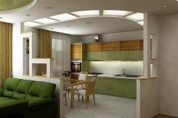 Барная стойка – классическая, модерн, хай-тек и так далее – наиболее популярный способ разграничить кухню и столовую (гостиную). Здесь удобно сервировать завтрак на скорую руку, пить чай, готовить обед и так далее. Обычно для установки столешницы используют часть стены, или выстраивают специальную перегородку из дерева, камня, кирпича. Автономное освещение над стойкой создает эффект завесы, что добавляет уюта в интерьер. Вариантов исполнения барной стойки великое множество, все они при этом функциональны, эстетичны и приемлемы. Важно заранее определиться с планом с размерами и расстановкой мебели.