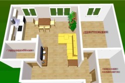 Четкое зонирование. Например, кухня-остров, зона отдыха и принятия пищи – мягкий уголок и обеденный стол. За счет лоджии можно увеличить кулинарную территорию, разместив на ней часть оборудования, например, холодильник. Там же, на бывшей лоджии хорошо поставить пару кресел и небольшой столик для кофе. Это и многое другое можно учесть, используя программу для проектирования.