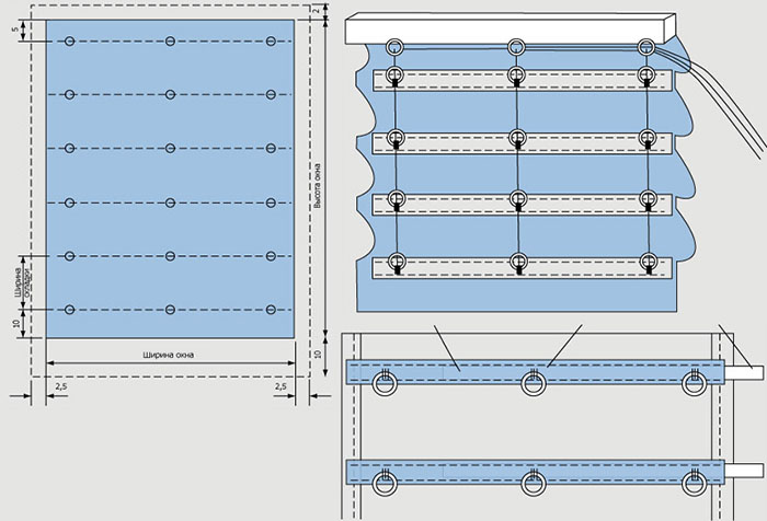 - Шнур, три отреза. Каждый из расчета 2 длины шторы +1 ширина шторы.