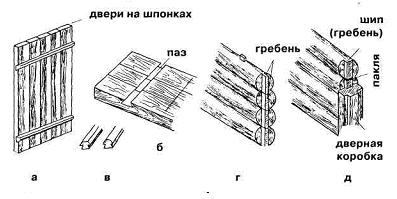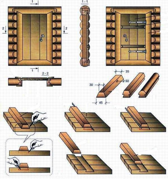 В стенах нашего строения на нижнем горизонтально расположенном бревне сделайте гнезда и вырубите гребни. В них в последующем вы и будете вставлять бруски с выбранными заранее шипами. В низ дверного проема положите массивное бревно, чтобы потом применить его в качестве порога.