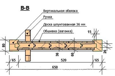 - для обвязки вам понадобится брус размерами 65х80 мм, а для полотна шпунтованные доски из сосны с габаритами 36 на 120 мм, для обшивки изнутри помещения — вагонка 12 на 96 мм;