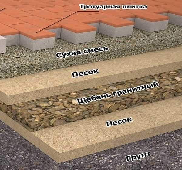Чтобы исключить или уменьшить подсос влаги из грунта, в данную последовательность надо добавить слой или, лучше два, гидроизоляции. Это может быть рубероид, другой рулонный гидроизоляционный материал, плотная полиэтиленовая пленка (плотность не менее 250-300 мкн), гидро- паро- изоляционная мембрана. Материал расстилают так, чтобы одно полотно заходило на другое. Полосы между собой склеивают. Если это пленка, использовать можно двухсторонний скотч, если рубероид или другой подобный материал, края можно промазывать битумной мастикой. Где расположить гидроизоляцию? Лучше, наверное, между грунтом и песком, а еще между песком и сухой смесью для укладки тротуарной плитки.