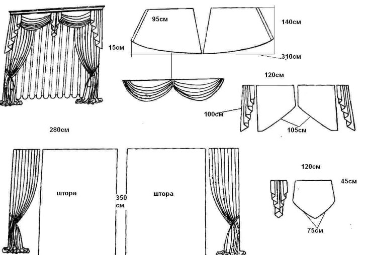 На изображении выкройки видно, как собирать и вырезать детали для того, чтобы пошить шторы своими руками. Для драпировки таких штор, ширина ткани должна быть в 2–3 раза больше длины карниза.