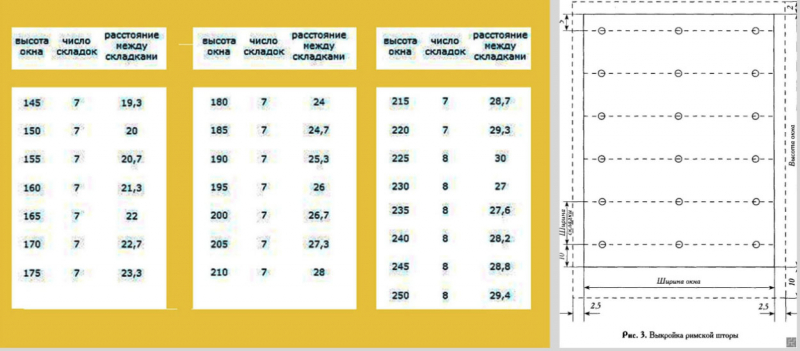 Расчет римской шторы потребует составления чертежа, измерения складок и кулисок для планок, подсчет их количества. Рекомендуется воспользоваться готовыми составленными таблицами, где указана высота окна, проставлено число складок и расстояние между ними. Обычно для пошива римской шторы добавляют 20% материала от определенной высоты изделия.
