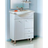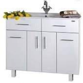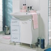Тумбы с корзиной отличаются друг от друга внешне и по цене, есть модели двухстворчатые и даже трехстворчатые с выдвижными ящиками. Все мы привыкли, что мебель в ванной как правило белого цвета, но при желание вы можете купить цветную мебель для ванной и в том числе с корзиной, есть и такие варианты в прайс листе. На нашем сайте также отдельно представлены просто тумбы – шкафы с корзиной, но без раковины. Как правило, размер тумб составляет 30, 40, 50, 60, 70 и даже 80 см в ширину, глубина от 30 до 40 см. Вся мебель комплектуется ножками, передние ножки хромированные, а задние из надежного пластика и регулируются по высоте.