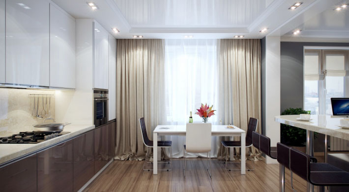 Если вы только собираетесь заняться ремонтом, то подойдет натяжной потолок с точечными светильниками (см. также люстра для кухни Модерн).