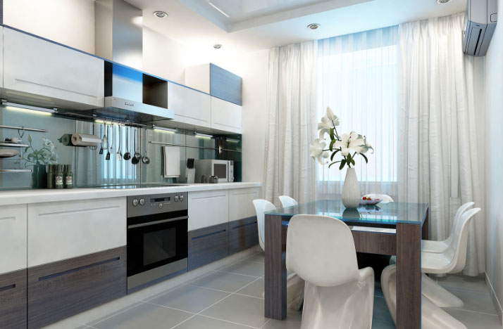 - Используйте стекло. Это особенно актуально для кухни в хрущевке, которую вы планируете оформить в стиле модерн.