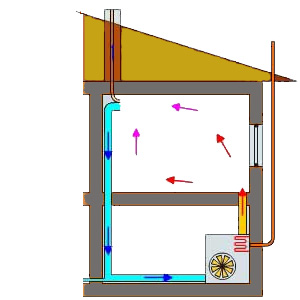 Теплый воздух выходит под потолком по воздуховодам, после чего, занимая значительный объем, вытесняет холодный вниз в сторону воздухозаборника, создавая циркуляцию воздуха в помещении, которое отапливается. Недостаток гравитационной схемы заключается в том, что из-за поступления холодного воздуха от дверей, открытых окон, сквозняков нарушится циркуляция воздуха. Вследствие этого возникнет слишком высокая температура в верхней части помещения и слишком низкая — в его рабочей части. Преимущество системы — независимость от электричества.