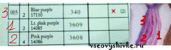 В ключе указан цвет blue purple. Этим цветом на схеме шьется полукрест в две нити, который обозначается красным крестиком. Нижние же два цвета (1,2), которые китайцы тоже прикрепили в эту же дырочку, не указаны в символах, что означает – эти цвета используются только для блендов. Собственно, далее в ключе обнаруживаем эти цвета под номерами 030 и 031. Кроме этого, согласно второму столбцу, ниточек должно быть явно больше, чем их вложили в этот номер.