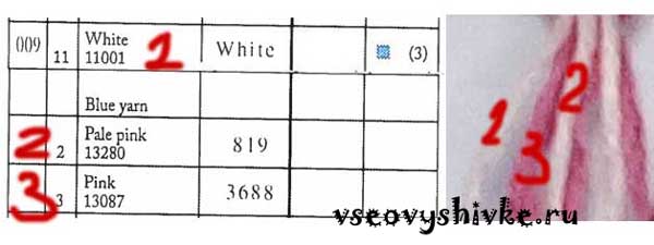 Удивляюсь, как они в 009 не впихнули ещё и «blue yarn». Тоже смотрите картинку – для вышивки требуется только белый, но на организаторе висят ещё и два оттенка розовых, которые потребуются только для смешанных крестиков. И количество пасм тоже далеко от необходимого для вышивки.