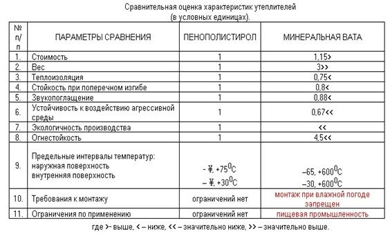В следующей таблице можно увидеть сравнение характеристик минеральной ваты и полистирола.