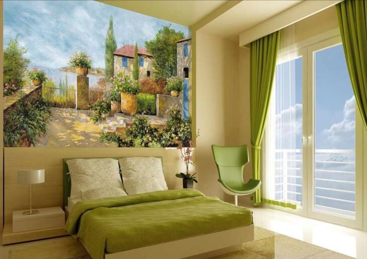 Габариты фрески тоже надо рассчитать еще до ее выполнения. Крупные изображения не впишутся в маленькую комнату, будут смотреться навязчиво, угнетающе. Роспись потолка тоже не всегда хороша для квартир: она подходит лишь при условии значительной высоты стен и большой площади комнаты.