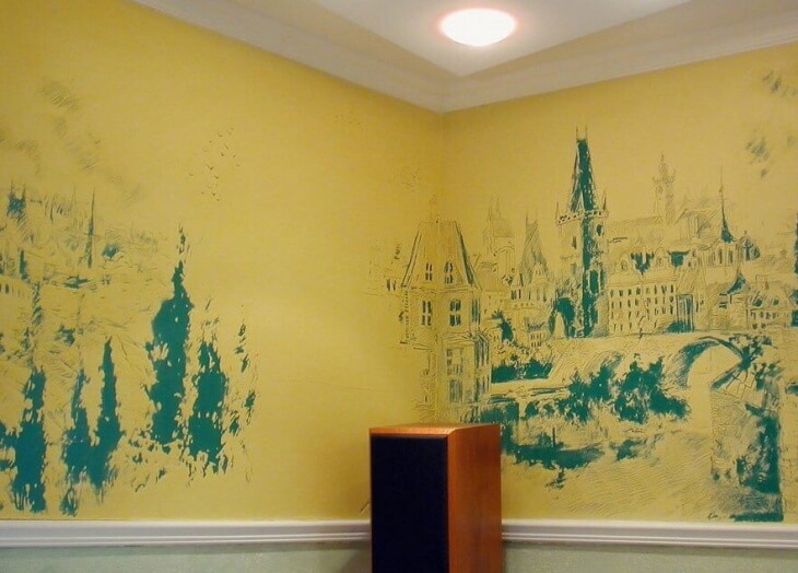 Интересно! При помощи живописи по сухой штукатурке можно выполнять разные концепции и рисовать картины любых стилей. Благодаря этому метод стал, популярен для интерьеров общественных мест.