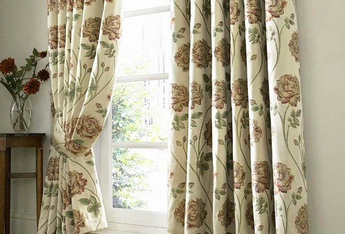 - Портьерные ткани (жакард, атлас, шелк, бархат, блэкаут, рогожка) . Хорошо подходят к стилю кантри, пользуется популярностью среди хозяек. Плотные и прочные материалы, обеспечивает отличную изоляцию, защищает зимой от холода, летом от солнца.