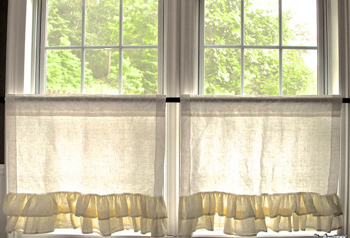 - Самый простой вариант, который изначально состоял из натянутой в оконном проеме веревки с подвешенными на ней занавесками. Сегодня такие шторы вешают на красивую перекладину и закрывают таким образом половину окна. Можно использовать как два полотна, так и одно.