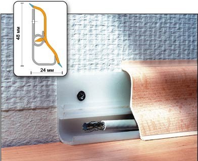 Если вы предполагаете проведение скрытой проводки, то лучше выбрать модель с кабель-каналом. Она имеет специальную нишу для укладки провода или кабеля, достаточно гибкий, что позволяет скрыть небольшие неровности стены и легко монтируется. К пластиковым плинтусам продается специальная фурнитура: