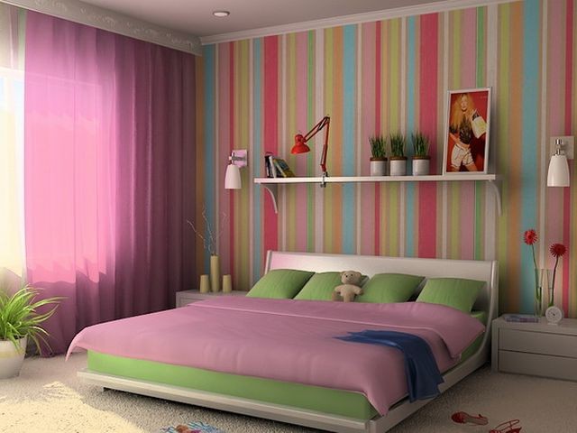 Обои с полосками светлых постельных оттенков наполнят помещение уютом, а полоски ярких, сочных оттенков помогут поднять настроения и создадут атмосферу веселья. Контрастные полоски одинаковой ширины сделают помещение более строгим, подчеркнут четкость линий, а яркие, многоцветные полоски разных цветов применяют для создания эмоционального тона.
