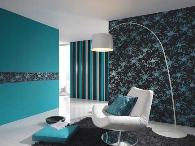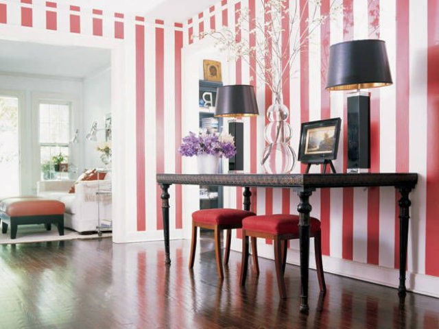 Обои с узором из узких полосок ярких и контрастных цветов с одной стороны делают помещение динамичным и живым, с другой стороны такой орнамент притягивает на себя все внимание, и остальные предметы интерьера уходят на второй план. Для того чтобы интерьер не выглядел перегруженным, не стоит оклеивать такими обоями все стены в помещении. Лучше всего использовать подобные обои для декора одной стены или какой-нибудь определенной функциональной зоны.