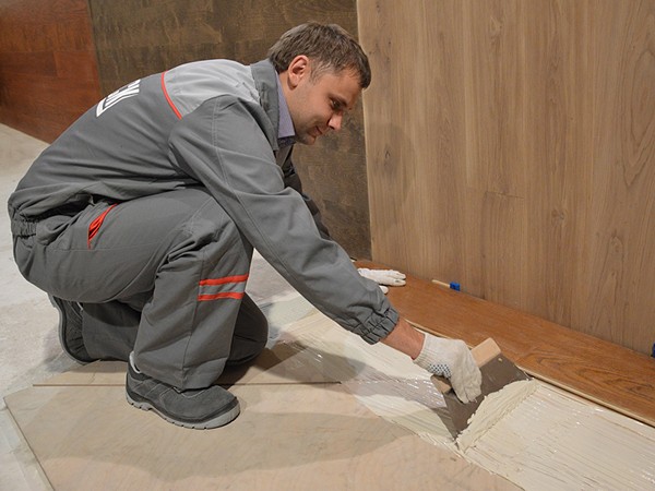 Клей наносят гребенчатым шпателем на основание, приблизительно на ширину двух, трех досок, таким образом, чтобы его бороздки располагались перпендикулярно доске (для свободного выхода воздуха).