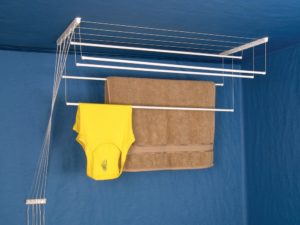 - Потолочная сушилка. Эта вместительная сушилка не займет много места и белье высохнет хорошо. Сушилка находится под потолком, и опускается вниз, когда нужно повесить белье. Есть два вида потолочных сушилок: траверсы и лианы. Первый представляет собой два траверса, между которыми крепятся перекладины. Сделана она из металла, что гарантирует долгий срок службы. Перекладины опускаются очень легко, поэтому даже пожилым людям с ней будет удобно. Сушилки-лианы представляют собой несколько реек, которые по одной опускаются на веревках. Рейки могут располагаться на одном уровне или на разных.