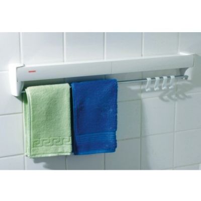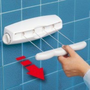 Представляет собой модуль с барабаном и выдвижной планкой, которая крепится крючками к противоположному краю стены. После снятия планки, барабан наматывает обратно бельевые веревки.