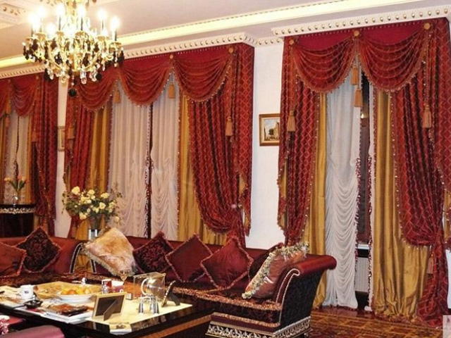 В комнате обязательно должны быть гардины, ниспадающие до самого пола, декорированные золотыми кистями. Они могут быть темных цветов, например, королевского синего, изумрудного, винного и бордо.