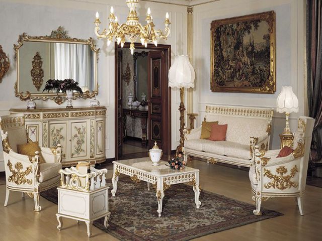 - Дорогая мебель. В данном стиле кровати, диваны, пуфы, столы, стулья и шкафы играют основополагающую роль. Каждый предмет мебели — это произведение искусства талантливых мастеров. Выбирают благородные породы древесины, а украшают изделия художественной резьбой, мозаикой, золочением и дорогим текстилем.