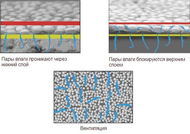 Этот комбинированный вариант продается в рулонах и имеет толщину 3 мм. За счет своей структуры он может вентилировать помещение. Верхний слой не дает проникнуть влаге внутрь, а тонкий нижний слой пропускает её внутрь к гранулам, и оттуда через технологические зазоры выходит наружу.